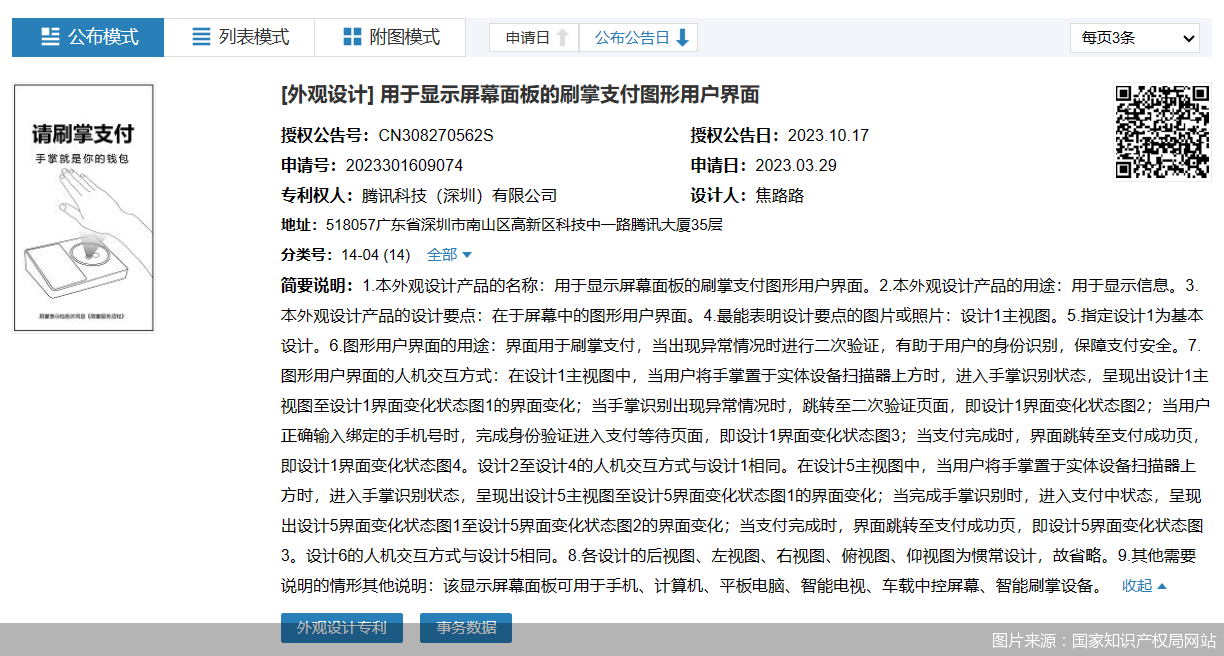 不仅是场景的拓展,在研发方面,微信对于刷掌支付的推动“双管齐下”。据国家知识产权局网站,10月17日,腾讯科技(深圳)有限公司“用于显示屏幕面板的刷掌支付图形用户界面”专利已获授权。这是一项外观设计专利,专利摘要显示,本外观设计产品用于显示信息,界面用于刷掌支付,当出现异常情况时进行二次验证,有助于用户的身份识别,保障支付安全。