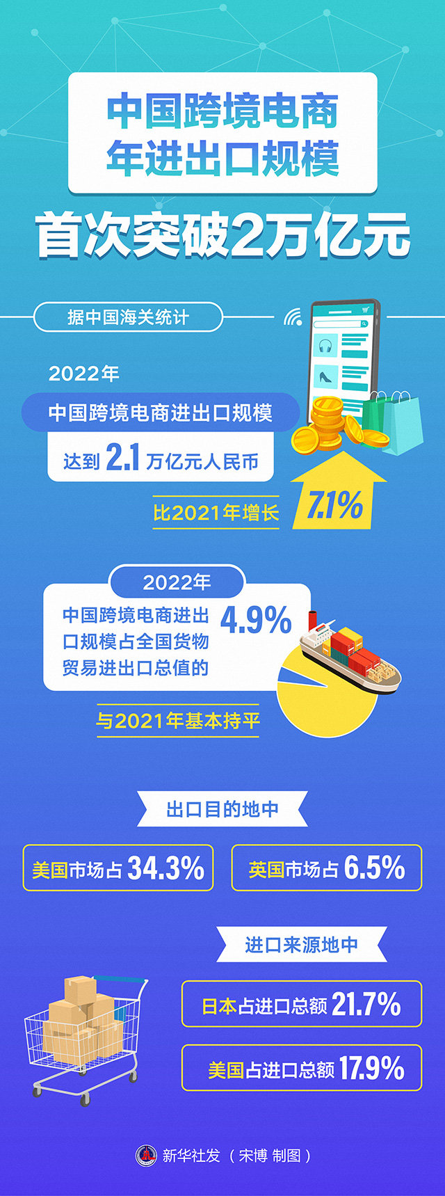 日前,在第40届中国·廊坊国际经济贸易洽谈会国际跨境电商发展论坛上,海关总署介绍2022年我国跨境电商进出口情况时表示,中国跨境电商进出口规模首次突破2万亿元人民币,达到2.1万亿元人民币,比2021年增长7.1%,跨境电商为我国外贸发展注入新动能。(央视新闻)