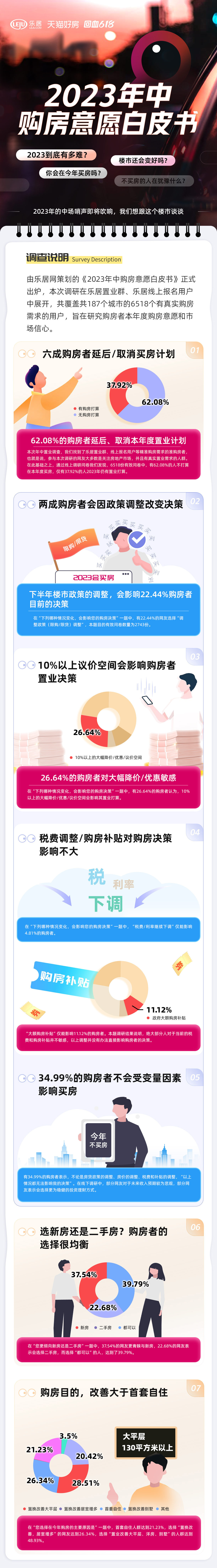 以上结果,为《年中购房意愿白皮书》的核心内容。本次调研在乐居置业群、乐居线上报名用户中展开,共覆盖共187个城市的6518个有真实购房需求的用户。希望本次调研,能为广大网友和卖方市场带来新的参考与启发。楼市的中场哨声已经吹响,2023年的下半场怎么进行,让我们拭目以待。