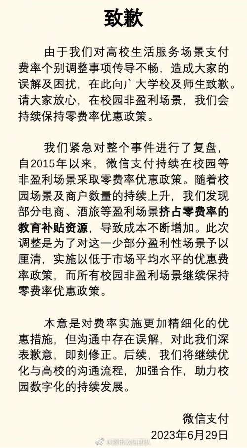 由于我们对高校生活服务场景支付费率问题处理不周,造成大家的困扰,在此向广大学校及师生致歉。请大家放心,在校园非盈利场景,我们会持续保持零费率优惠政策。我们紧急对整个事件进行了复盘,自2015年以来,微信支付持续在校园等非盈利场景采取零费率优惠政策,但由于我们在费率精细化管理上有所欠缺,随着校园场景及商户数量的持续上升,大量涉及电商、酒旅等盈利场景占用了零费率的补贴资源,导致成本不断高涨,为此承担的银行通道成本超过10亿元。此次调整,仅针对电商、酒旅等小部分盈利性场景实施以低于市场平均水平的优惠费率政策,校园非盈利场景则继续保持零费率。此次调整的本意是为了对费率实施更加精细化的优惠措施,但很显然过于简单粗暴引起误解,我们深表歉意,即刻修正,后续我们将继续优化与高校的沟通流程,加强合作,助力校园数字化的持续发展。