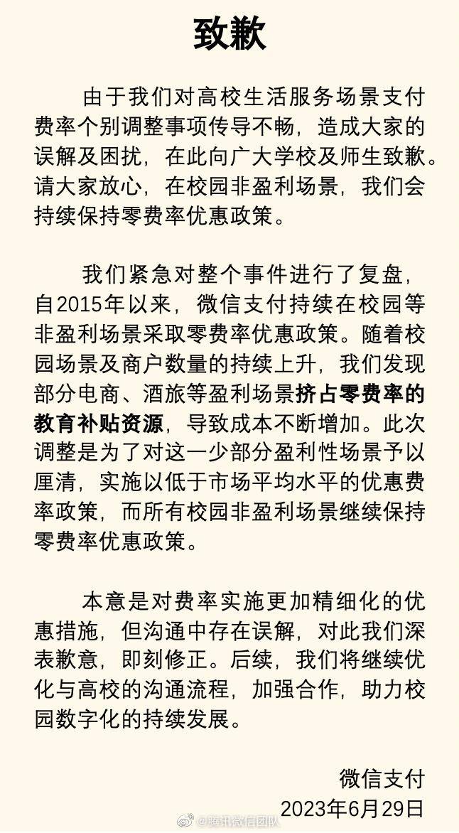 腾讯微信团队致歉:微信支付优惠措施调整引起误解,校园非盈利场景继续保持零费率优惠政策