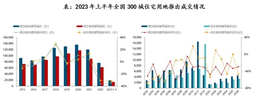 房企聚焦核心城市头部价值板块,局部城市土拍升温。2023年上半年,全国300城住宅用地推出2228宗成交1622宗,成交规划建面仅为13528.67万平方米,全国300城住宅用地供求规模均降至近十年以来同期最低位,同比分别下降33.8%、31.4%。全国销售承压背景下,房企在核心城市补货意愿增强,北京、杭州等城市多宗地块竞拍至最高上限,部分地块创下近几年土地参拍企业数量记录。值得注意的是,在市场筑底修复的阶段,“安全性、流动性、收益性”都较为确定的核心城市优质地块,是房企“抢地、争夺”的重心。这类地块周边供地稀缺性较强,未来去化速度有保障,市场预期较好。