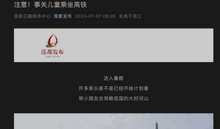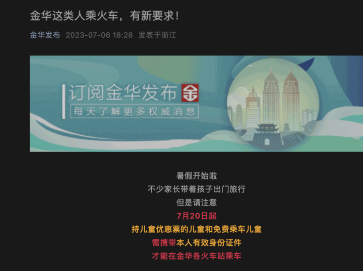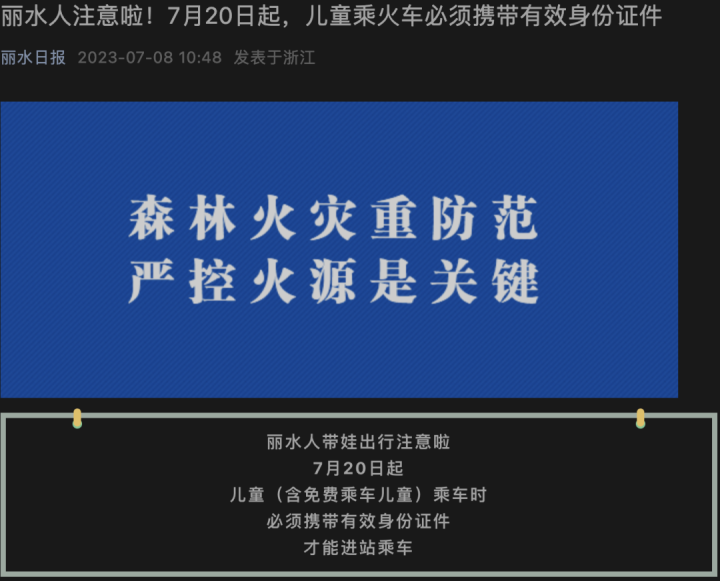 最近,@丽水发布、@安吉发布、@金华发布、@成都发布等官方公众号均就此发布了出游提醒:7月20日起儿童(含免费乘车儿童)乘车时必须携带有效身份证件才能进站乘车,忘带儿童实体身份证了,家长可在火车站人工售票窗口办理临时身份证明。但如儿童未有实体身份证,则无法办理临时身份证明。