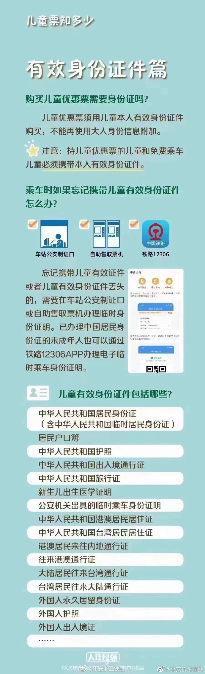 据平安浙江铁路最新消息,从2023年7月20日开始,儿童(含免费乘车儿童)乘车时必须携带有效身份证件才能进站乘车。忘记携带儿童有效证件或者儿童有效身份证件丢失的,需要在车站公安制证口或者自助售取票机办理临时身份证明。换句话说,儿童乘车一定要带相关证件。