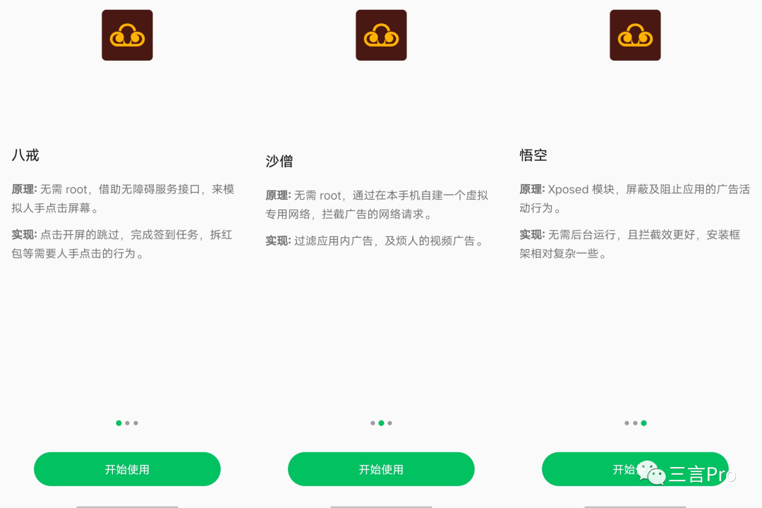 初次打开大圣净化会有一个简单介绍。该软件有三种功能,分别被称为“八戒”、“沙僧”和“悟空”。