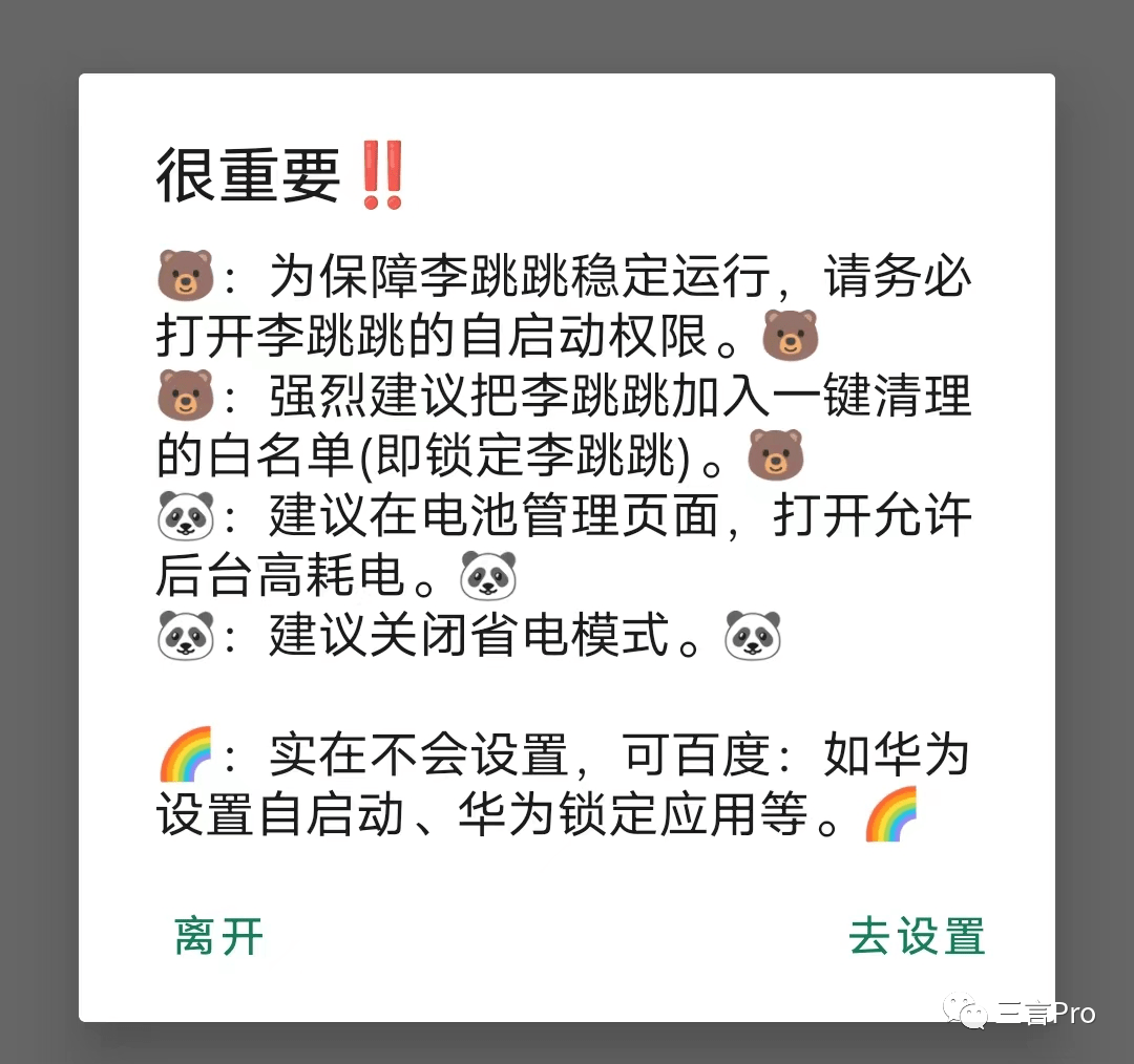 按照其提示的步骤操作后,会提示:“为保障李跳跳稳定运行,请务必打开李跳跳的自启动权限。强烈建议把李跳跳加入一键清理的白名单。建议在电池管理页面,打开允许后台高耗电。建议关闭省电模式。”