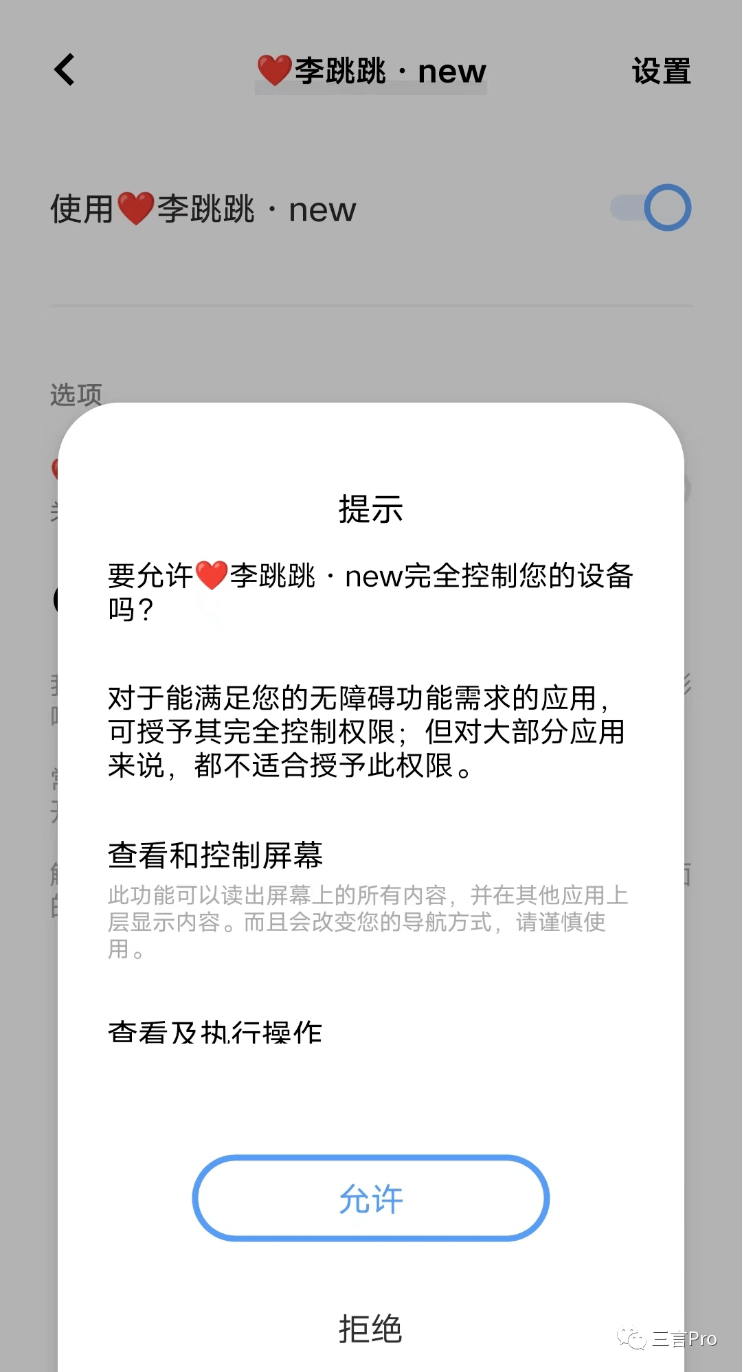 打开后,提示“要允许李跳跳完全控制您的设备吗?对于能满足您的无障碍功能需求的应用,可授予其完全控制权限;但对大部分应用来说,都不适合收取此权限。”