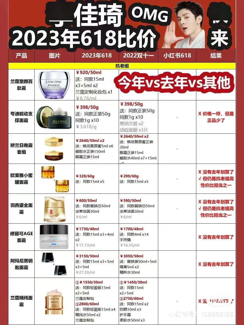 在小红书上博主晒出的李佳琦618比价表中整理了多款护肤品的价格,“没有去年划算了”。