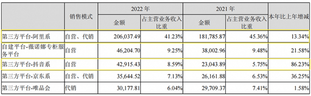 一些脱身于淘系的“淘品牌”也已经在抖音生态中找到了新的增量。根据薇诺娜母公司贝泰妮2022年财报,在抖音系营收主营业务比重从上年的5.75%增至8.59%,相较之下,淘系仍旧为其贡献了近半营收,但占据主营业务的比重也在发生变化,从上一年的45.36%下滑至41.23%。