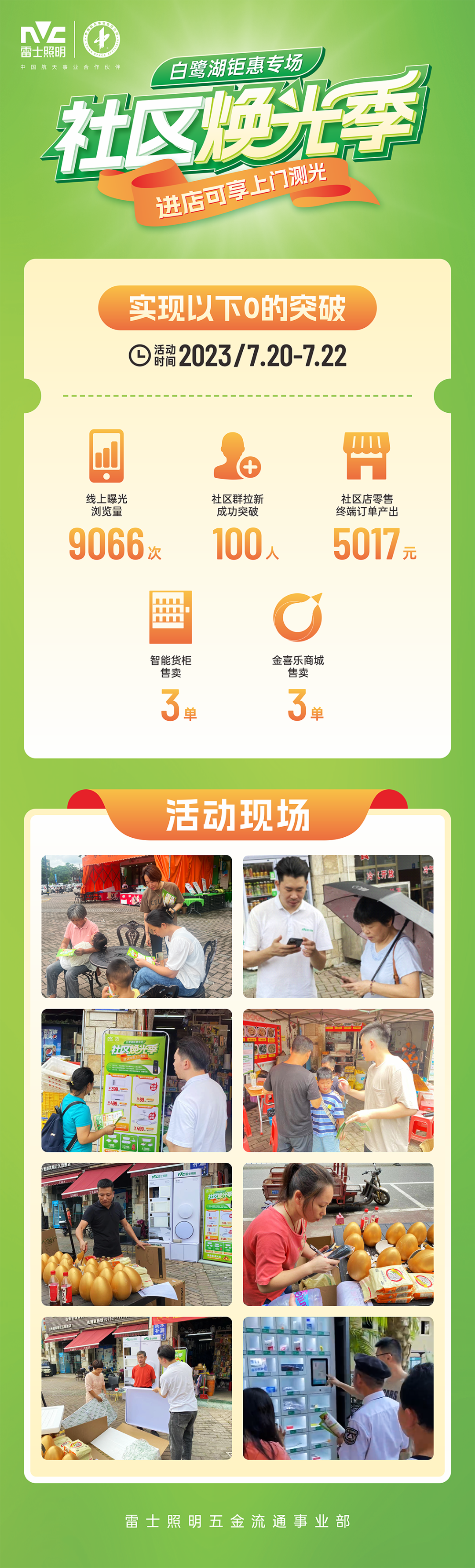 7月20日至22日,五金流通事业部与数字化战略管理部、产品管理中心在雅居乐白鹭湖举办“社区焕光季”社区活动。活动促成“藏金阁”智能货柜和金喜乐线上商城的首单成交,线上精准曝光9066次,助力社区门店“非凡五金”零售订单,形成了独立的社区活动体系。