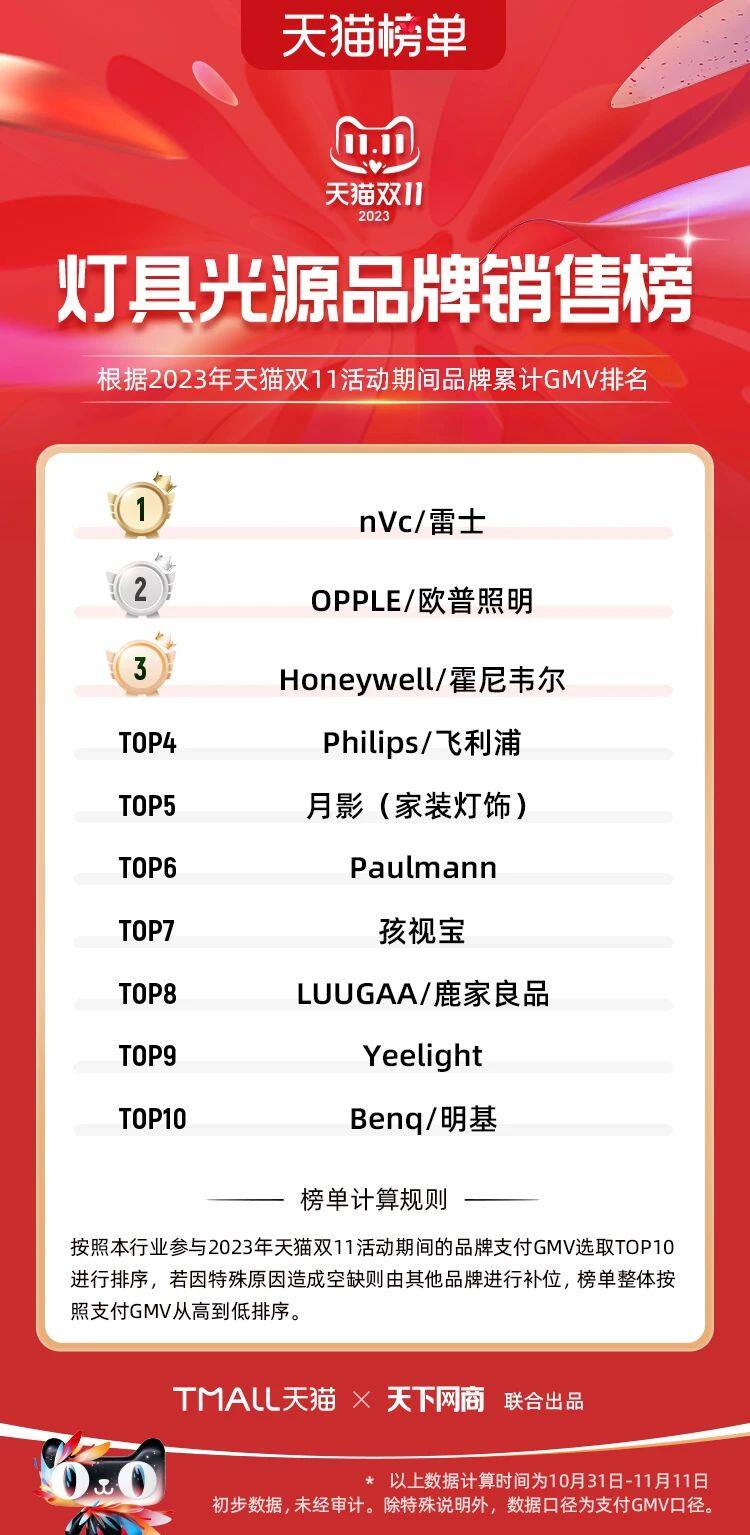 据2023天猫双11“灯具光源品牌销售榜”显示,雷士位列第一,欧普照明、霍尼韦尔分别排名第二、三位,飞利浦、月影(家装灯饰)、Paulmann、孩视宝、鹿家良品、Yeelight、明基则分列第四名至第十名。