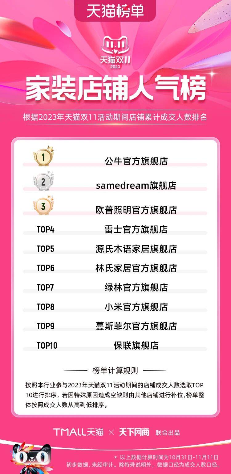 而在“天下网商”发布的2023天猫双11“家装店铺人气榜”上,亦有不少照明灯饰电工品牌上榜,包括位列榜单第一名的公牛官方旗舰店、第三名的欧普照明官方旗舰店以及第四名的雷士官方旗舰店。这一榜单是根据2023年天猫双11活动期间店铺累计成交人数排名。