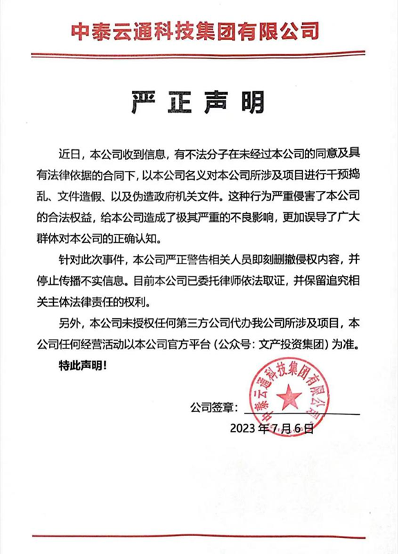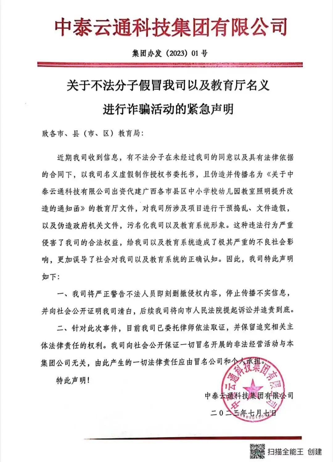 实质上,在该广西壮族自治区教育厅正规“红头文件”发布前,该事件牵涉其中的中泰云通科技有限公司就已经两度发文,声明称有不法分子以其名义对其所涉及项目进行干预捣乱、文件造假、以及伪造政府机关文件,并严正警告相关人员即刻删撤侵权内容,停止传播不实信息。