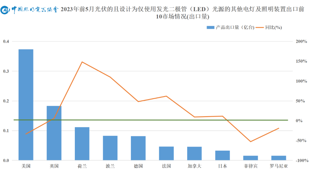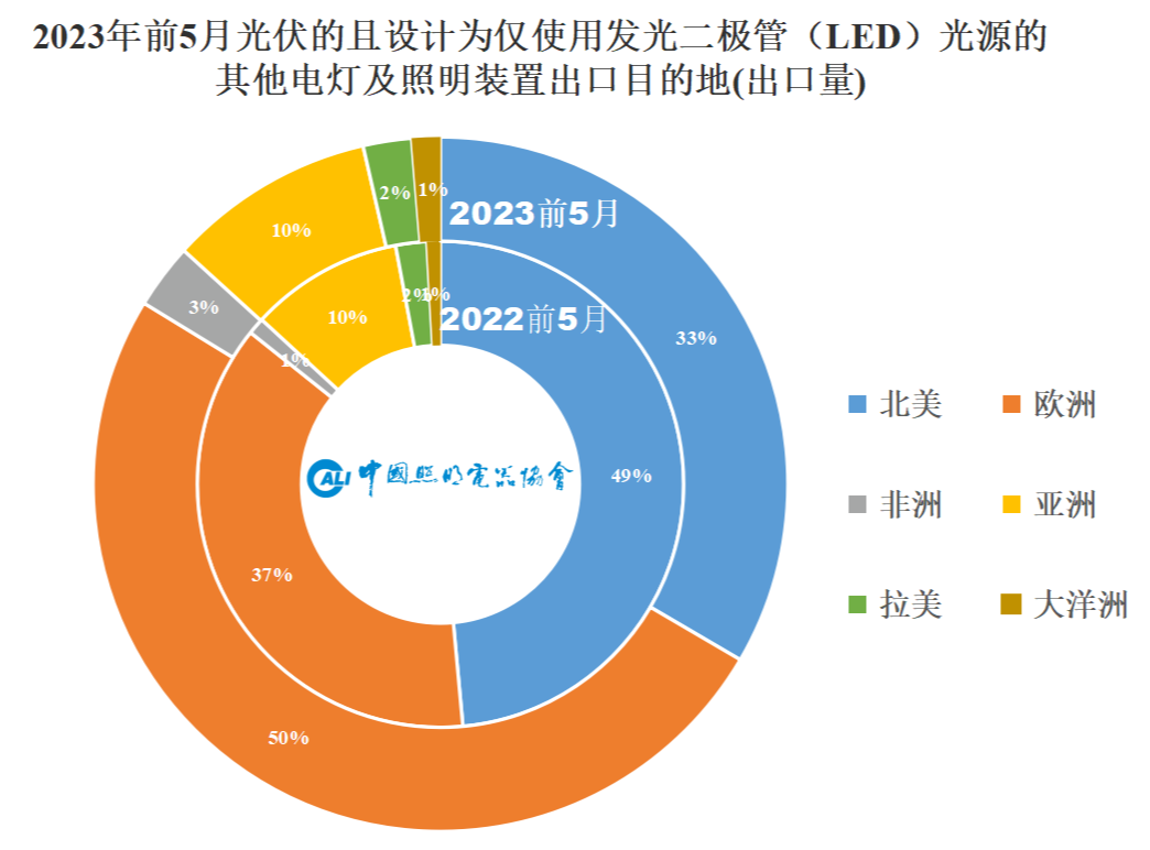 2023年1-5月,我国“光伏的且设计为仅使用发光二极管(LED)光源的其他电气灯具及照明装置”出口量约1.3亿台,同比增长1%;出口额约5亿美元,同比增长15%,约占灯具类产品出口总额的3%,约占我国照明出口总额2%;出口均价约4美元/台,同比增长约14%。