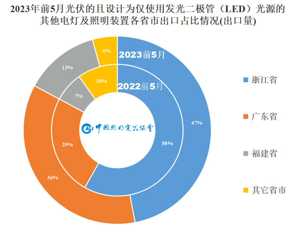 从各省出口情况来看,浙江、广东、福建等省份是光伏LED照明产品的主要出口地,约占出口量的96%,同比增长约6个百分点。
