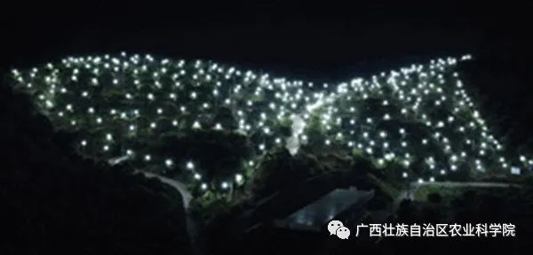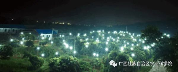 由此证明,夜晚大面积亮灯不会吸引周围果园的鳞翅目昆虫前来为害,反而可能会抑制其它鳞翅目害虫为害。同时研究发现,夜晚亮灯果园的荔枝蛀蒂虫成虫只会静息在枝干处直至死亡,不会飞到周围未亮灯果园为害。这也解除了使用该技术果农的后顾之忧。