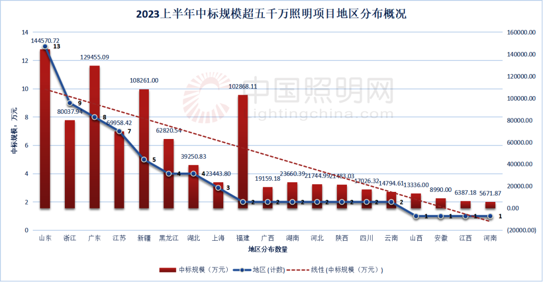 据中照网不完全统计,2023上半年规模在五千万以上的照明项目共计71项,分布在山东、浙江、广东、江苏、新疆、黑龙江、湖北、上海、福建、广西、湖南、河北、陕西、四川、云南、山西、安徽、江西、河南19个省市。中标总规模达912920.0139万元,共有85家企业中标。