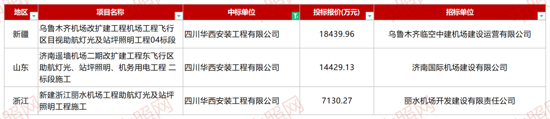 从企业中标数量看,四川华西安装工程有限公司中标项目数量最多,总规模达39999.36036万元,拿下《乌鲁木齐机场改扩建工程机场工程飞行区目视助航灯光及站坪照明工程04标段》、《济南遥墙机场二期改扩建工程东飞行区助航灯光、站坪照明、机务用电工程 二标段施工》、《新建浙江丽水机场工程助航灯光及站坪照明工程施工》三项机场灯光建设项目。