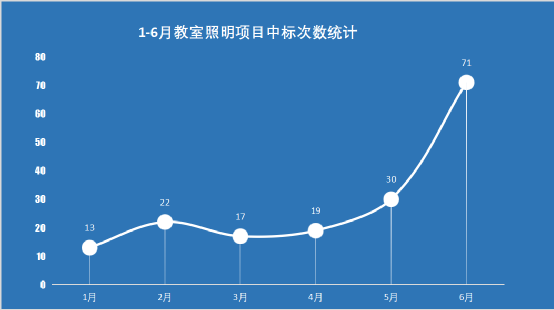 从中标次数看,整体上教室照明落地项目呈上升状态。5、6月份落地项目数量相对较多,其中,6月为上半年落地项目最多71个。另外,随着防疫政策放松,今年上半年落实项目相对去年上半年同比增长112%。