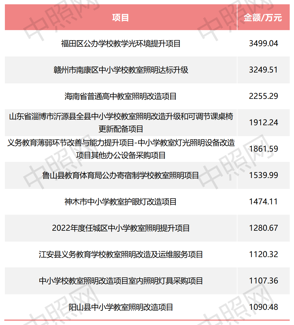 单项中标最高金额3499.04万元,江苏移动信息中标数量最多根据数据显示,上半年仅有11个教室照明项目金额超过一千万,分别为《福田区公办学校教学光环境提升项目》、《赣州市南康区中小学校教室照明达标升级》、《海南省普通高中教室照明改造项目》、《山东省淄博市沂源县全县中小学校教室照明改造升级和可调节课桌椅更新配备项目》、《义务教育薄弱环节改善与能力提升项目-中小学教室灯光照明设备改造项目其他办公设备采购项目》、《鲁山县教育体育局公办寄宿制学校教室照明项目》、《神木市中小学教室护眼灯改造项目》、《2022年度任城区中小学教室照明提升项目》、《江安县义务教育学校教室照明改造及运维服务项目》、《中小学校教室照明改造项目室内照明灯具采购项目》、《阳山县中小学教室照明改造项目》。