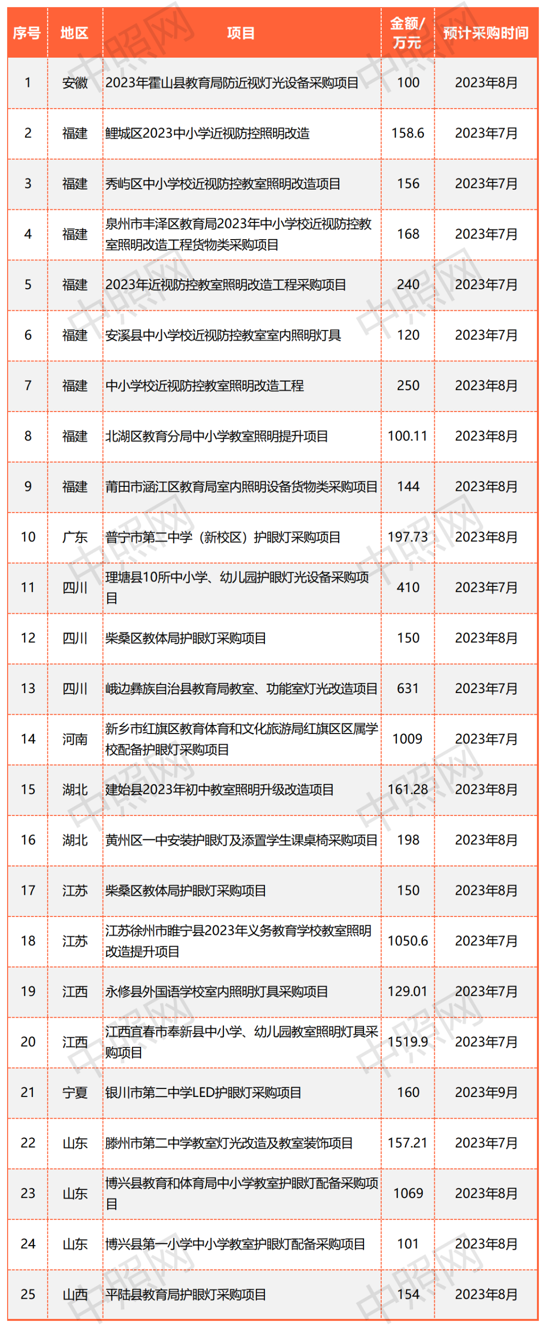 据统计目前共有25个教室照明政府意向采购项目,投资总金额约8684.45万元。