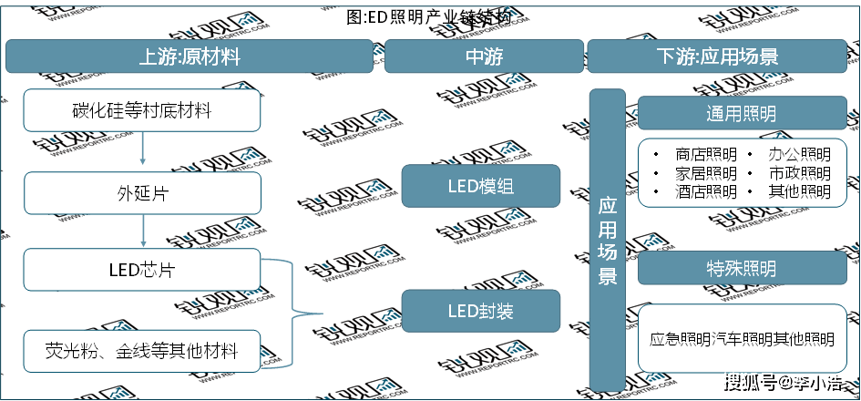 LED照明产业链上游包括外延片、LED芯片等环节;中游主要是LED封装环节,LED封装流程包括扩晶、固晶、引线与注胶等;下游为应用场景,使用场景包括家居、工业、酒店、汽车等。