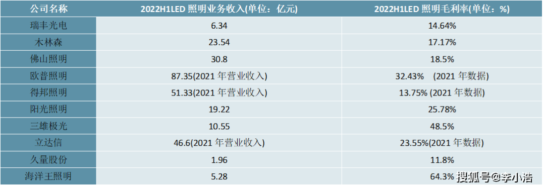 从业务收入角度分析,2022H1佛山照明LED照明业务收入最多,为30.8亿元;从毛利率角度分析,海洋王照明LED照明毛利率最高,为64.3%,其次为三雄极光,毛利率为48.5%。