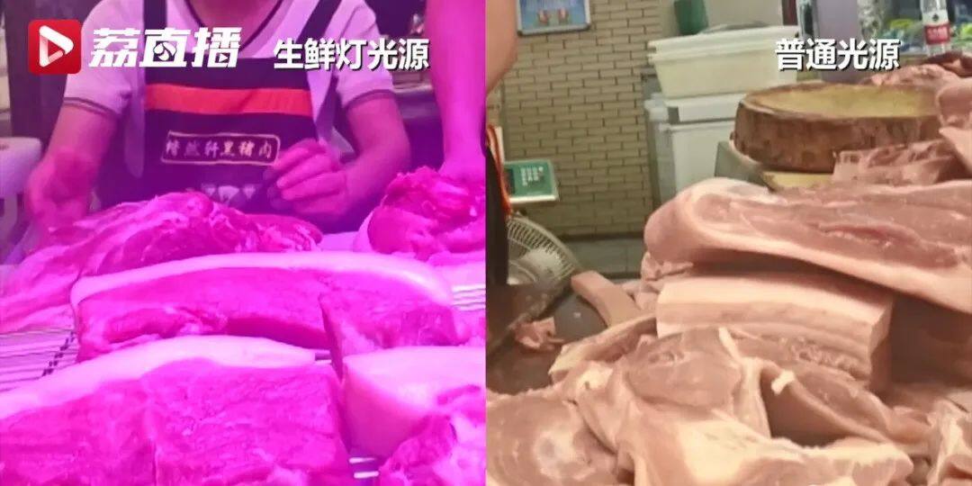 食材“美颜”靠打灯,俗称为“生鲜灯”的灯光。在“生鲜灯”的过度“上色”下,消费者根本看不出食材是否新鲜。