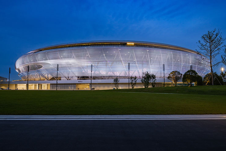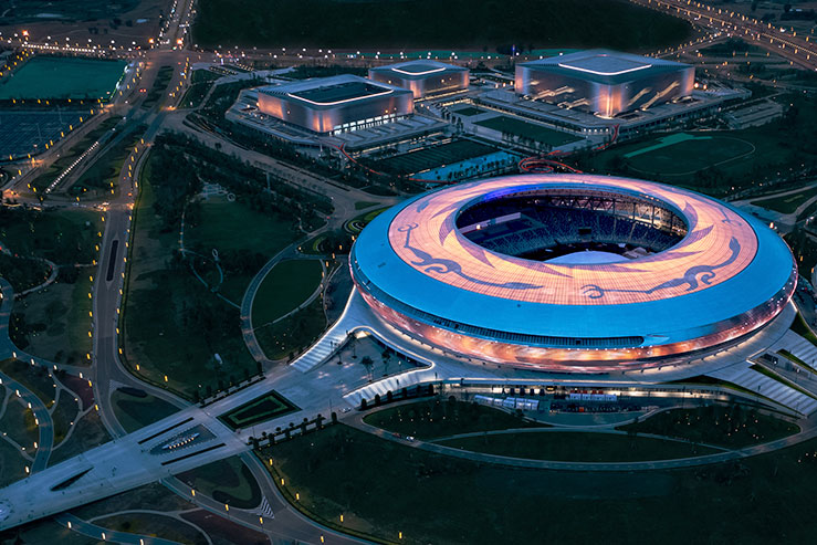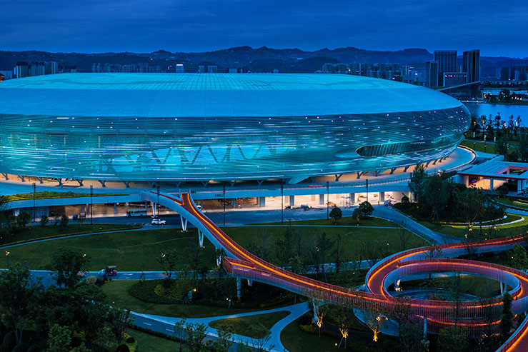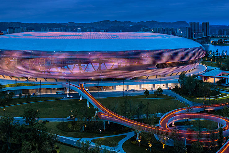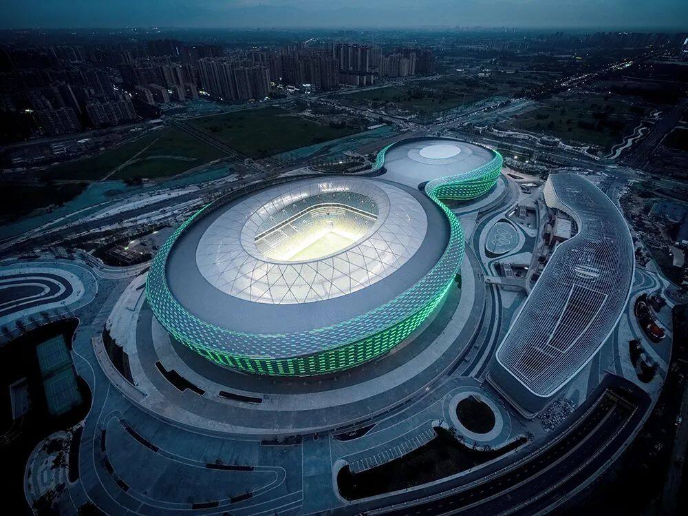 主体育场由中国建筑西南设计研究院有限公司设计,最多可容纳40,000名观众。体育场的整体建筑设计类似于一艘宇宙飞船,一个圆形的“飞碟”。特色照明强调了这一主题和美学,并能够通过使用高度灵活和动态的组件进一步激活。