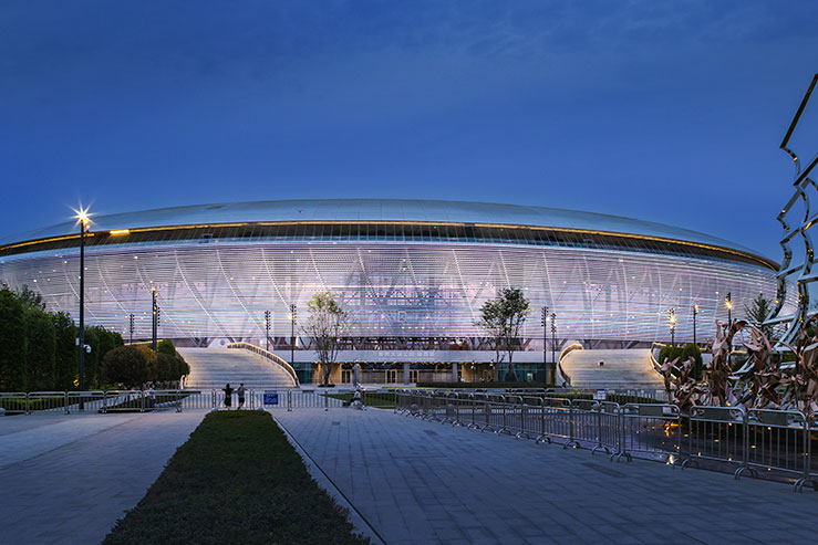 场馆外立面安装了小型化设计的飞利浦LED线条灯,高亮度,高能效,持久耐用,能融入狭小空间,强调建筑细节,产生与建筑充分融合的照明效果。它突破了传统照明的限制,动态的色彩及图案变化给比赛增添了生动的气息。