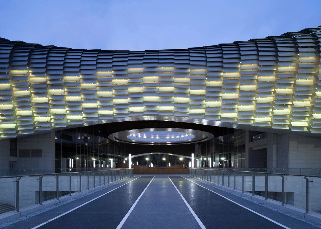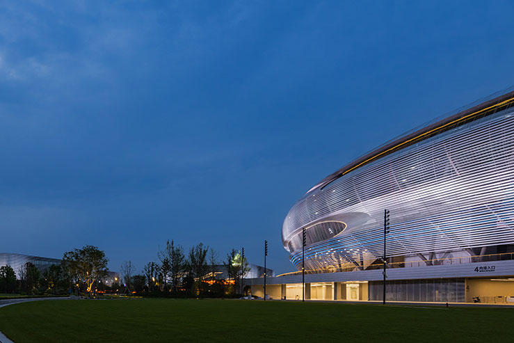 体育馆外立面设计强调建筑群体的整体性,通过引入流畅的曲线和不同穿孔率的金属穿孔板,形成疏密有致、舒缓灵动的建筑表皮,对传统“蜀锦”肌理进行抽象表达,演绎出独特、现代的建筑形象,使之既有独特的艺术风格,又能传递出浓浓的四川文化情愫,体现成都作为“锦官城”所特有的雅致、时尚而又个性十足的生活格调。“蜀锦”的外立面肌理进一步融合“韵动丝路、绿绣锦城”的理念,设计团队希望建筑如“蜀锦”缎带一般跃动于“锦官城”中,带动起一片充满活力的城市绿洲。