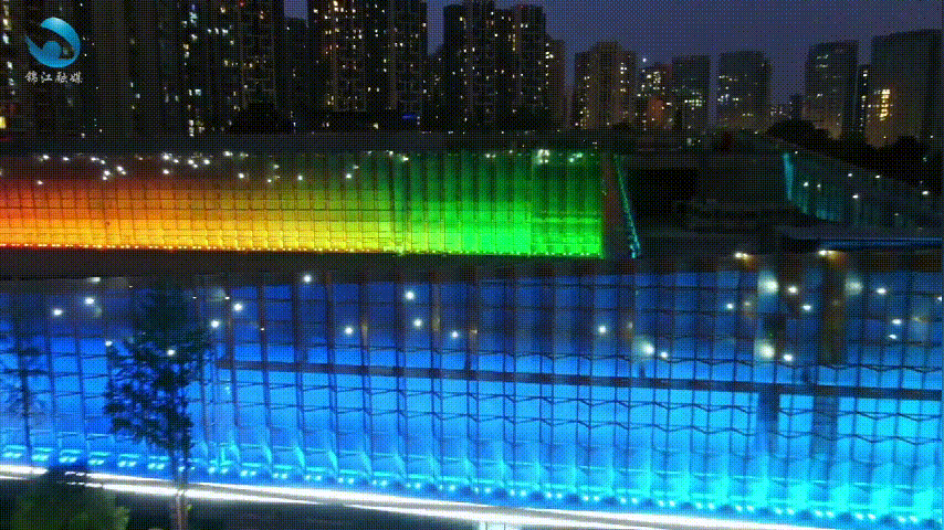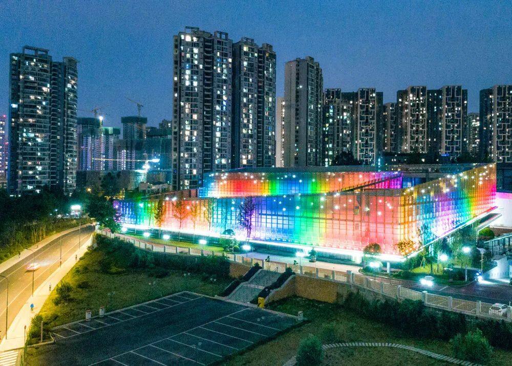 七彩重叠,缓急交替,绚丽的灯光交相辉映,美不胜收。夜空褪去沉闷与静谧,增添了一道赏心悦目的风景线,洋溢着青春般的活力,“彩虹馆”矗立夜空。