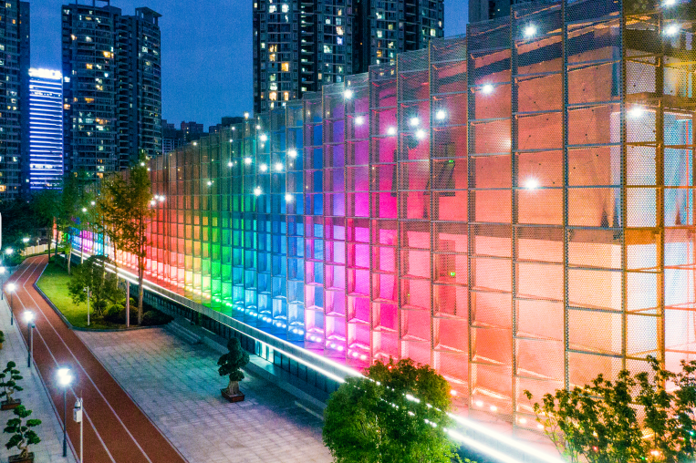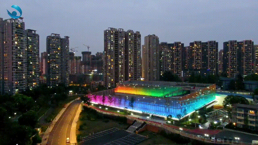 赤橙黄绿青蓝紫,随着斑斓的霓虹灯一一点亮,射击馆外立面“动”了起来。