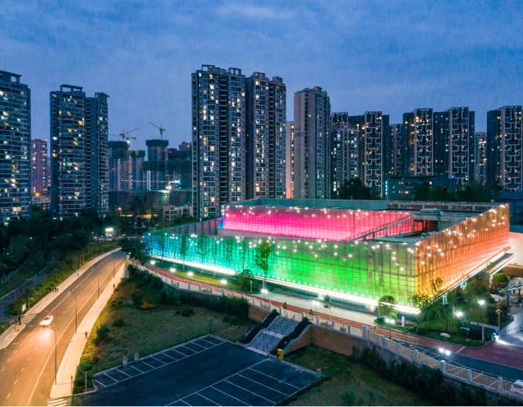 同时,建筑外形由七个折面构成,其倾斜的角度、肌理的疏密,随建筑形体自然的渐变过度。且项目的立面取意于传统的蜀锦,立面在不同曲面上通过大小不一及白色与银灰色两种不同穿孔率的铝板,营造出一种波光粼粼、织有序的立面效果。整个建筑仿佛是一幅在城北的光影下,跟随自然的律动而变幻着的“蜀锦画卷”。
