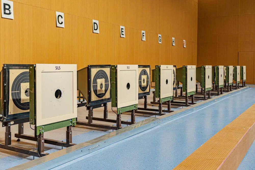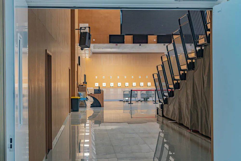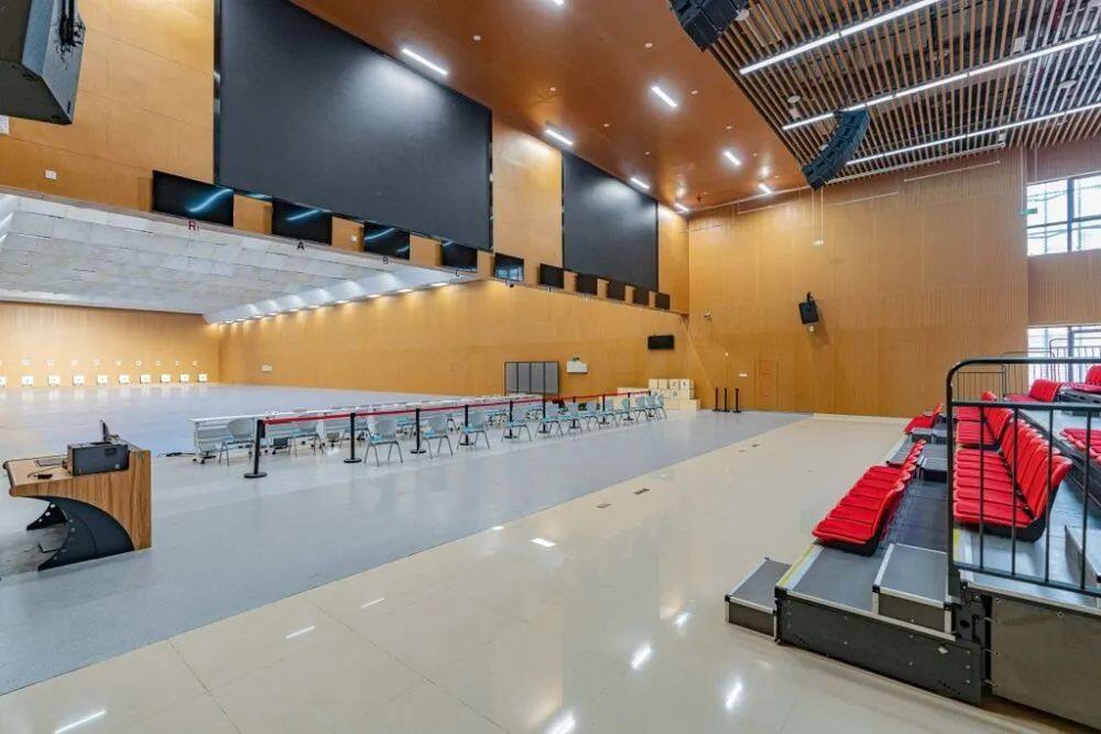 射击场四周墙面,均装有吸声设备,现场的智能化比赛信息查询终端、场地扩声、计时计分以及显示屏系统等应有尽有,功能齐全。