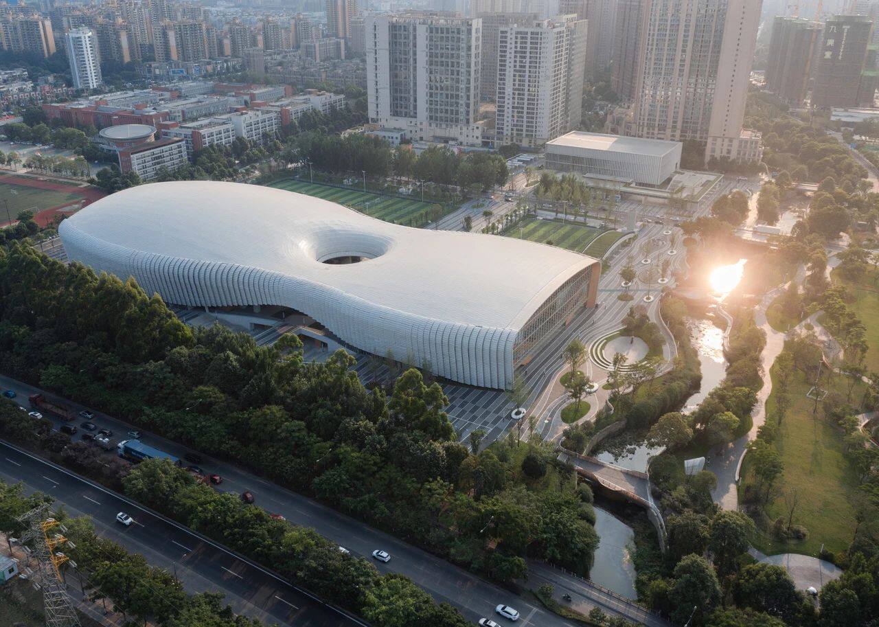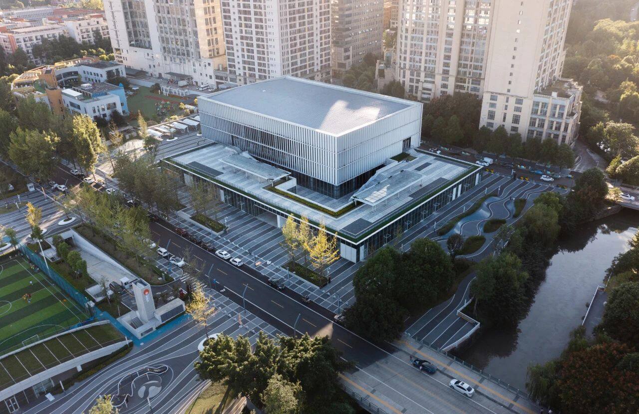 简洁的建筑形态在光影的动态变幻中,彰显着现代特色与巴蜀韵味,犹如一颗璀璨的明珠,闪耀在东安湖畔。