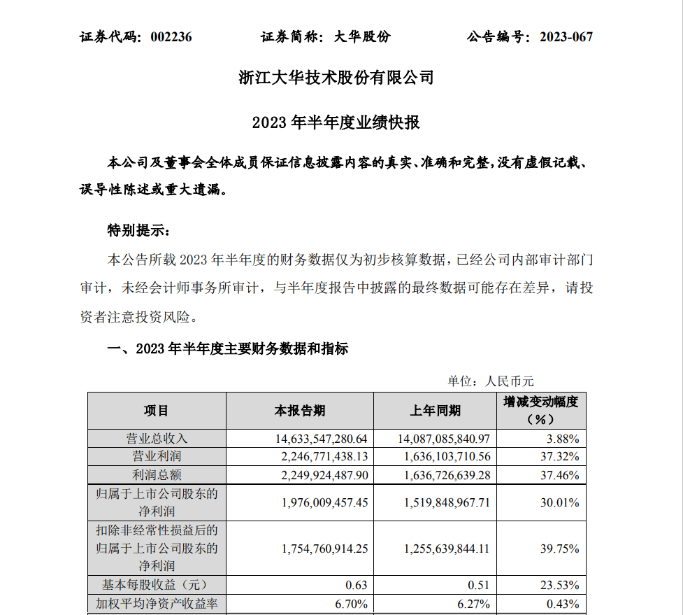 快报显示,大华股份2023年上半年实现营业收入146.34亿元,同比增长3.88%;实现净利润19.76亿元,同比增长30.01%。