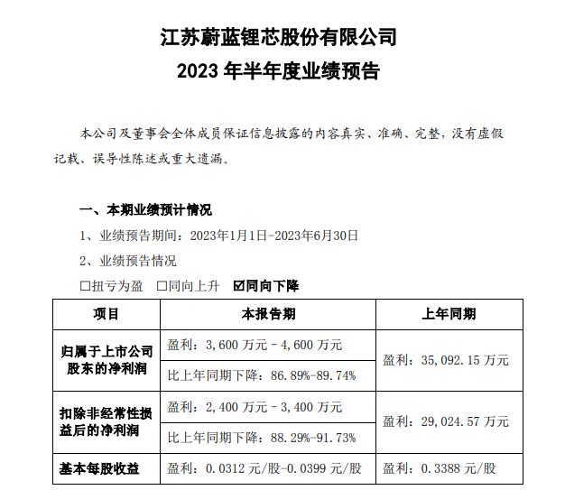 7月14日,蔚蓝锂芯发布2023年半年度业绩预告