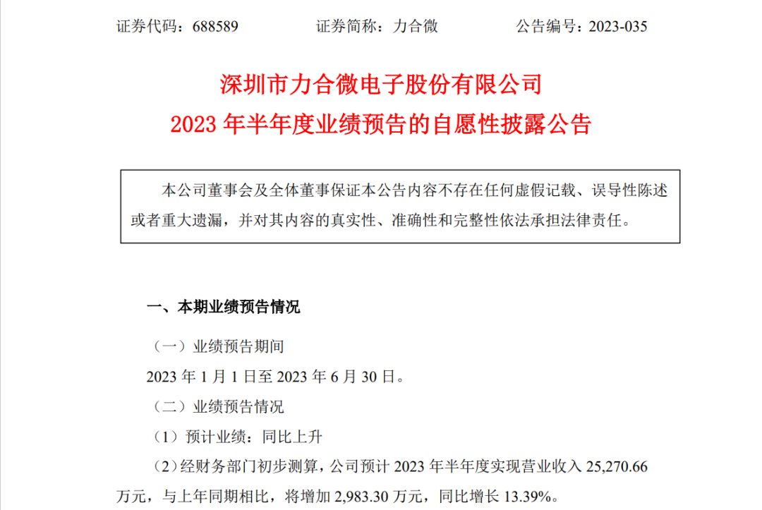 7月11日,力合微发布2023 年半年度业绩预告的自愿性披露公告。