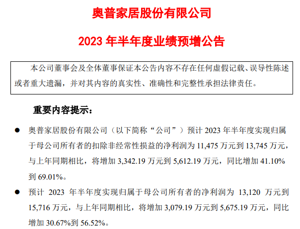 7月10日,奥普家居发布2023年半年度业绩预增预告。