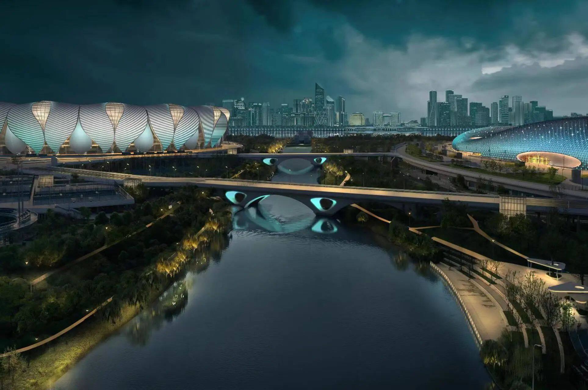 七甲河畔两岸点光连缀,流光溢彩。项目投用后,奥体场馆群夜景会得到进一步提升,在亚运来临之际配合开幕式演绎精彩。