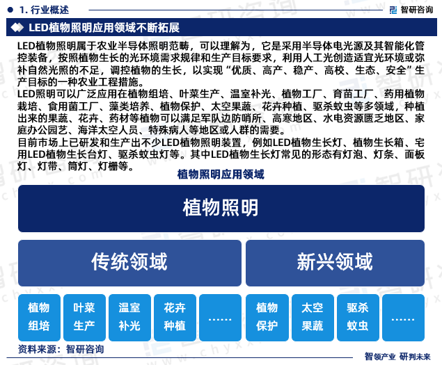 植物照明为照明产业在农业领域的应用开拓了广阔持久的下游市场。其不仅可以促进植物的光能利用率,提高产量,还能改善植物的形态色泽、内在成分等,因而在粮食生产、果蔬培育、花卉种植、药用植物栽培、食用菌、藻类工厂、驱蚊杀虫等领域都得到了广泛应用。适宜高效的植物照明灯具,配备上智能优化的光控策略,使得作物培育不再受到自然光条件的拘束,对于增强农业产出、保障农产品安全具有非常重要的意义。