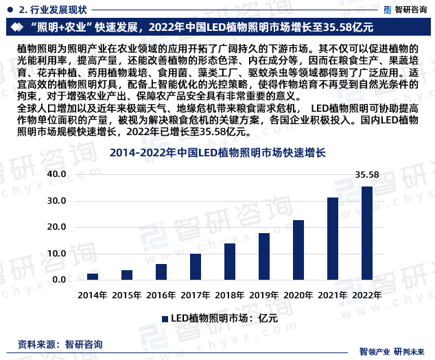 全球人口增加以及近年来极端天气、地缘危机带来粮食需求危机, LED植物照明可协助提高作物单位面积的产量,被视为解决粮食危机的关键方案,各国企业积极投入。国内LED植物照明市场规模快速增长,2022年已增长至35.58亿元。