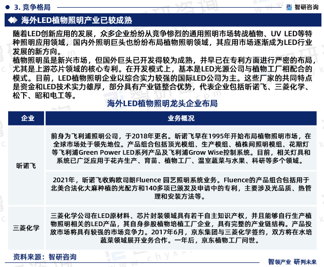 目前,LED植物照明企业以综合实力较强的国际LED公司为主。这些厂家的共同特点是资金和LED技术实力雄厚,部分具有产业链整合优势,代表企业包括昕诺飞、三菱化学、松下、昭和电工等。