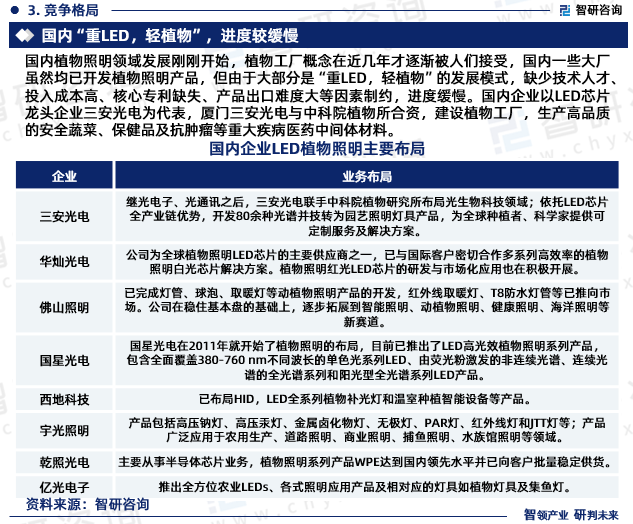 国内企业以LED芯片龙头企业三安光电为代表,厦门三安光电与中科院植物所合资,建设植物工厂,生产高品质的安全蔬菜、保健品及抗肿瘤等重大疾病医药中间体材料。