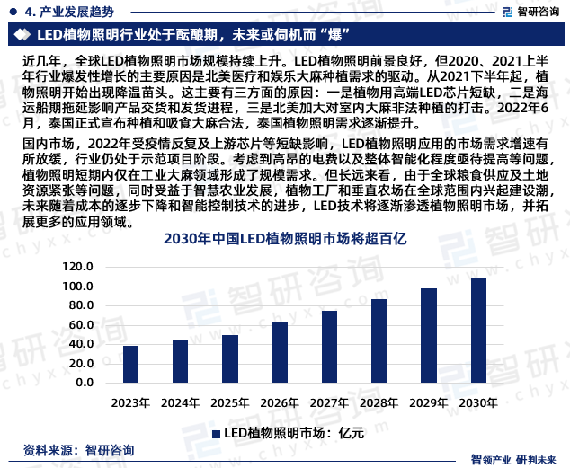 国内市场,2022年受疫情反复及上游芯片等短缺影响,LED植物照明应用的市场需求增速有所放缓,行业仍处于示范项目阶段。考虑到高昂的电费以及整体智能化程度亟待提高等问题,植物照明短期内仅在工业大麻领域形成了规模需求。