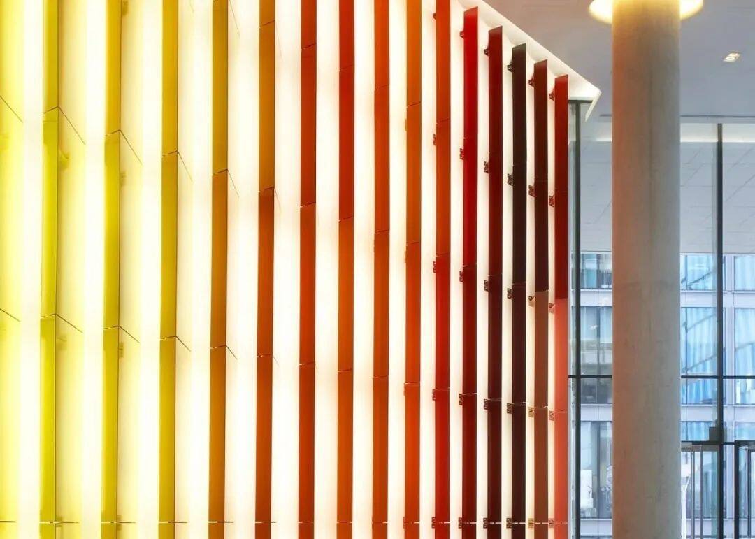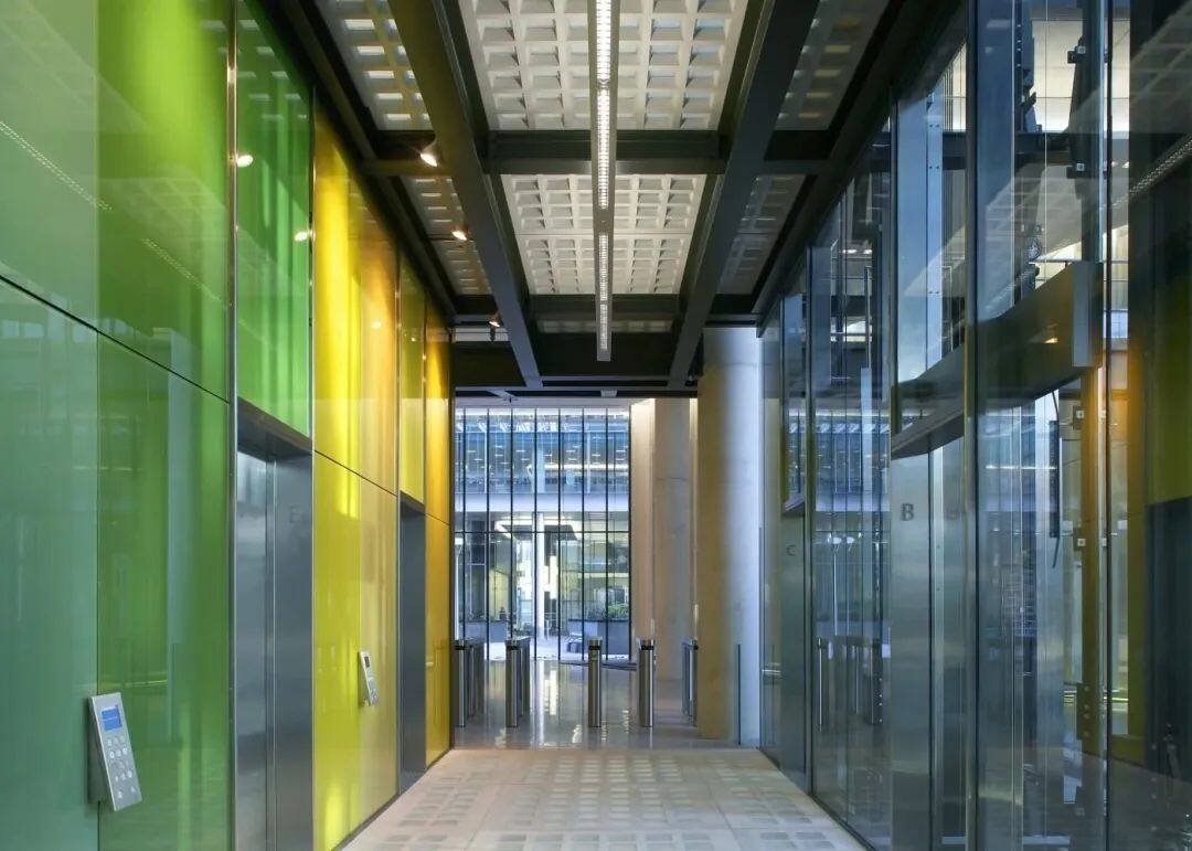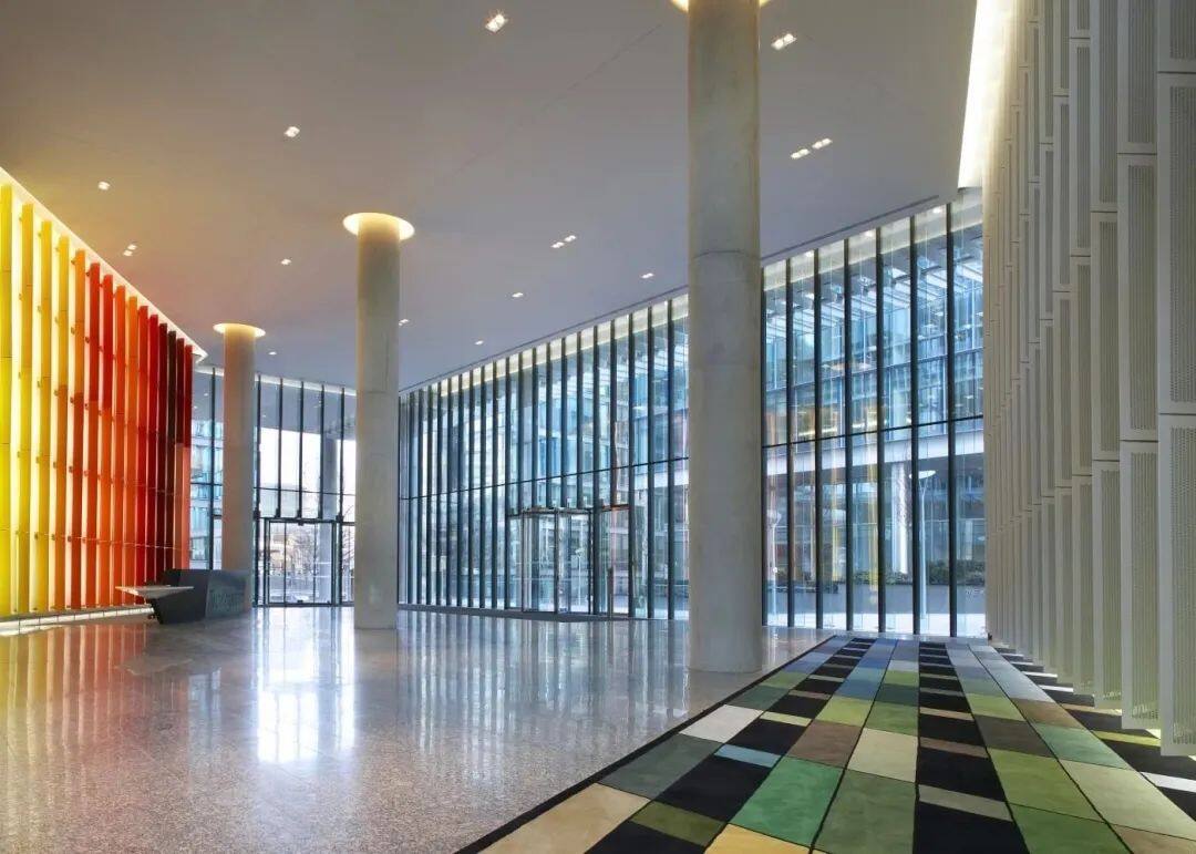 王国街2号的主大厅为其余的流通空间定下了基调。巧妙的环境照明为生动的彩色特色墙营造了背景,而不会破坏三层高度空间的视觉效果。