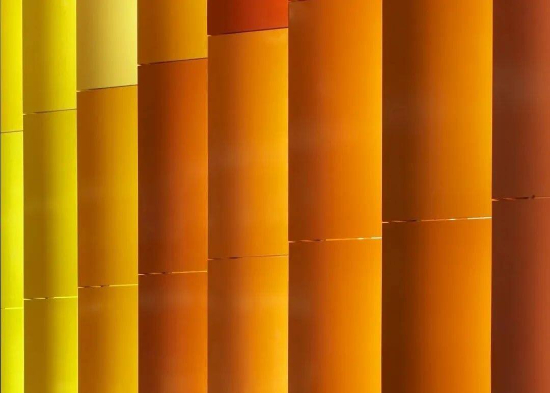 彩色玻璃鳍片采用无缝背光设计,为接待台提供了令人兴奋的背景。在大堂对面,隐藏在天花板上的灯光轻柔地冲洗着金属网翅墙。网格墙也漂浮在一个隐藏的线性光垫上,这些光垫安装在踢脚板上。为了完成特色照明包,柱子消失在天花板的孔洞中,被明亮的光晕掩盖。