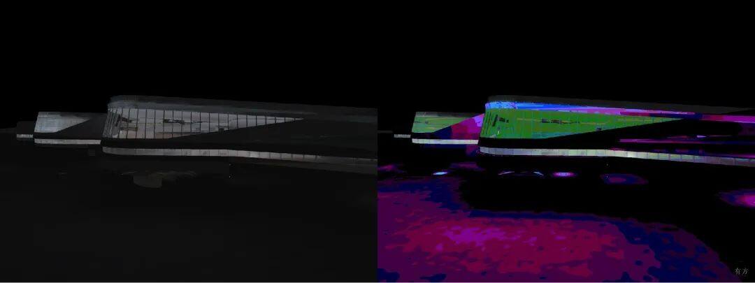 在夜晚时,虽然没有观众的参观需求,但作为照明设计师,我们仍然需要考虑场馆的活动和营造“眼睛”亮起的效果。新馆建筑以简洁的弧线为特点,拥有干净纯粹的材质表面,呈现消隐的建筑外观。
