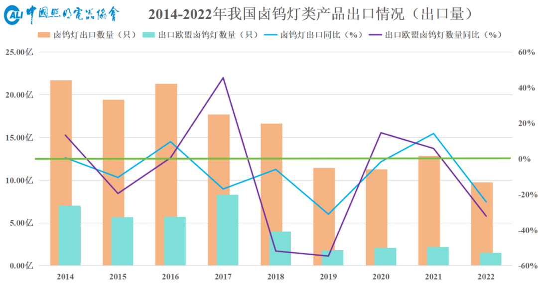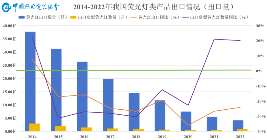 2019年发布的欧盟光源和独立控制装置生态设计规则以及2022年2月发布的12项RoHS授权指令,将在未来几周内影响普通照明用的紧凑型和直管型荧光灯以及市电电压卤钨灯和低压卤钨灯在欧盟市场的投放。随着LED照明产品的快速发展,其高效、节能属性越发受到市场的青睐。荧光灯、卤钨灯等传统照明产品逐渐退出市场。近年来,为应对气候和能源问题,欧盟高度重视电器产品的节能环保属性,不断提升有关产品性能要求。据海关数据,2014-2022年,我国出口欧盟的荧光灯类和卤钨灯类产品的出口量持续下降。其中,荧光灯类产品出口量下降接近77%;卤钨灯类产品出口量下降接近79%。